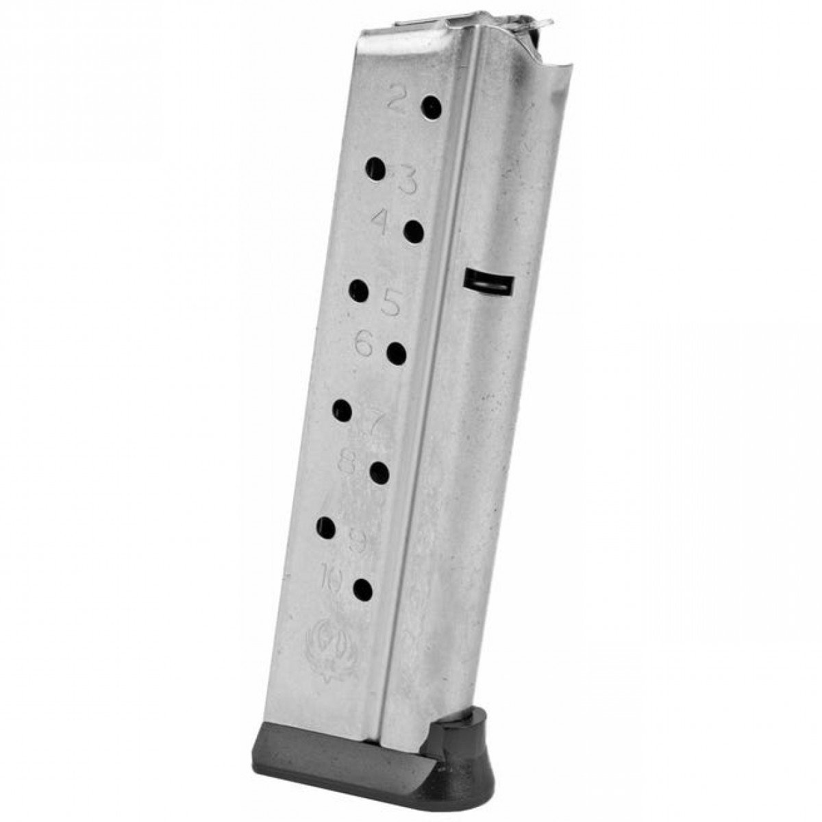 Ruger SR1911 9mm Luger Competition 10-Round Magazine. Constructed of laser-welded stainless steel with a corrosion-resistant nickel finish, this genuine Ruger factory magazine is designed to deliver repeatable performance in unforgiving environments. Equipped with a high-tensile steel spring and stainless steel follower, this magazine delivers exceptionally smooth operation, while numbered witness holes allow for quick round counts at a glance. This magazine has a polymer base pad for improved durability and shock resistance in demanding applications.